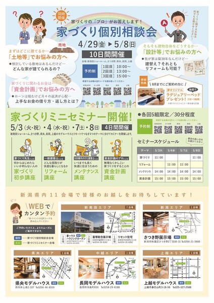 | 開催時間: | *家づくり* ①5/3(火)11:00~ ②5/8(日)11:00~ *リフォーム* ①5/4(水)11:00~ ②5/7(土)11:00~ *メンテナンス* ①5/3(火) ②5/4(水) ③5/7(土) ④5/8(日)各日14:00~ *資金計画* ①5/3(火) ②5/4(水) ③5/7(土) ④5/8(日)各日15:00~ | 定員: | 【予約制】 各時間 5組様 |