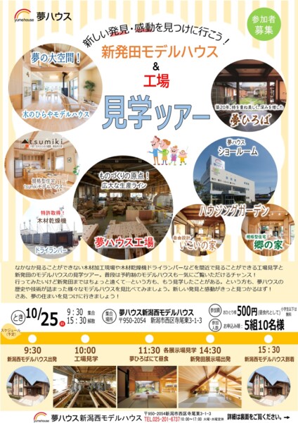 | 開催時間: | 9:30 新潟西モデルハウス集合 ~ 15:30 新潟西モデルハウス解散 | 定員: | 5組10名様 |
