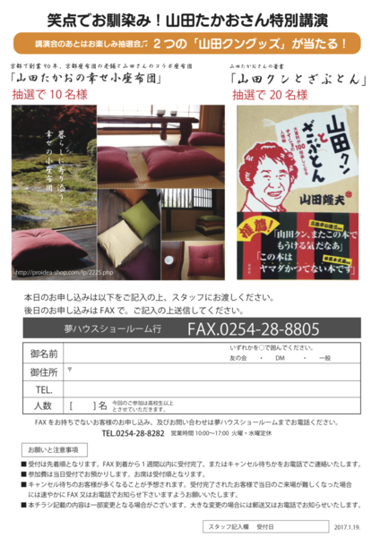 | 参加費用: | 2,000円 | 会場名: | 夢ハウスショールーム3階セミナールーム |